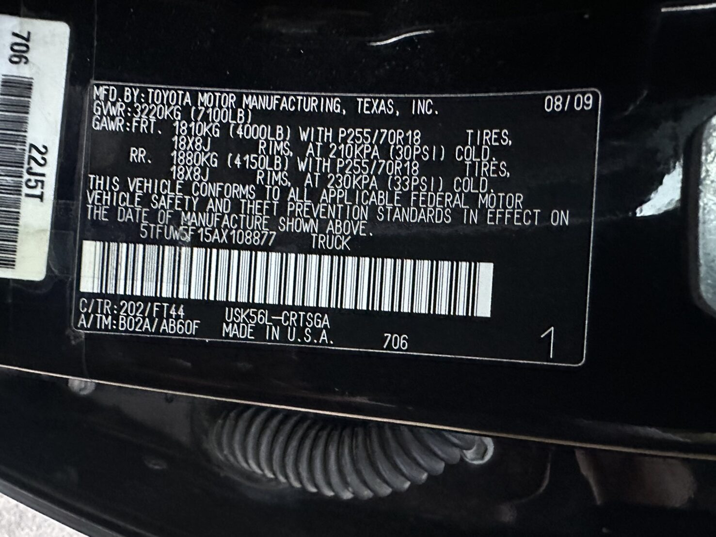 Chassis No. (1)129069/5TFUW5F15AX108877